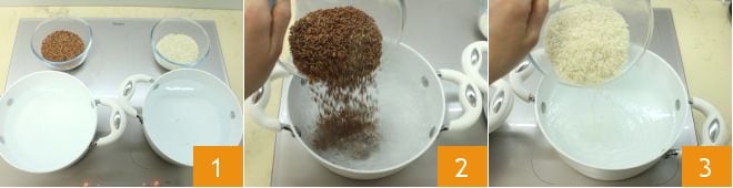To make the basmati and red rice salad, start by cooking the rice; the cooking times for boiling the two types of rice are different, so you will need to cook them separately: place two pots of water on the stove and bring to a boil 1, in one pour the red rice 2 and in the other the basmati rice 3. Boil the red rice for about 30 minutes and the basmati for about 15 minutes (or for the time indicated on the individual packages).