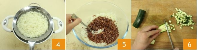 Once cooked, drain the rice 4 and combine them in a large bowl, season with a drizzle of olive oil and mix with a spoon 5. Wash, trim the zucchini, and cut them into cubes 6.