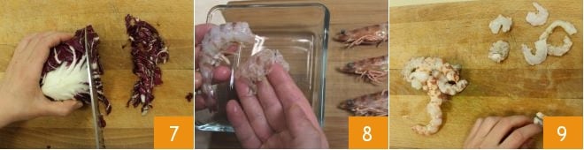 Wash the radicchio and cut it into thin strips 7. Finally, clean the prawns (or shrimp): remove the head, shell 8, tail, and extract the intestine, then split the prawns in half lengthwise 9 and gently remove the intestine, the internal black thread.