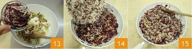 At this point, turn off the heat and add the radicchio 13, let it cool, and then incorporate the now cold rice 14 and mix with a spoon to flavor them. The basmati and red rice salad is ready 15; serve it immediately or store it in the refrigerator until it's time to bring it to the table.