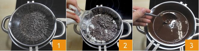 To prepare the bavareisa, melt the dark chocolate (in pieces or chopped) in a bain-marie 1 and mix it together with the milk and cream 2. Melt thoroughly to achieve a smooth, creamy chocolate without lumps 3. Once ready, keep it warm.