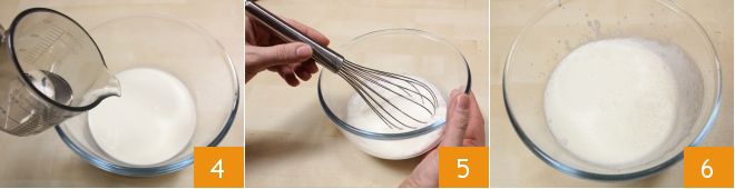 Move on to the topping preparation, place the cold cream, cold milk, and sugar syrup in a bowl 4, then whisk the ingredients together 5 to achieve an aerated, creamy mixture but not whipped 6, which you'll store in the refrigerator.