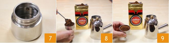 Meanwhile, prepare the coffee with the moka pot: to make excellent coffee, fill your moka pot's boiler with cold water, preferably low in calcium, making sure not to exceed the safety valve 7 (otherwise you'll get a longer coffee). Fill the filter with ground coffee, forming a small mound that you'll level by tapping the filter on the table with decisive movements (8-9). Do not press with the spoon, nor make holes on the surface.