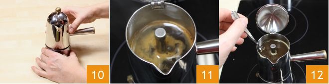 Tightly close the moka pot 10 so that the coffee doesn't leak from the sides while rising, and place it on a low, steady flame to achieve a rich coffee. As the coffee rises, a thick foam will form 11: we recommend not letting the coffee bubble for too long to keep its sweetness and aroma intact. Your coffee is ready: before using it, stir it directly in the moka pot with a spoon to make the coffee more homogeneous 12.