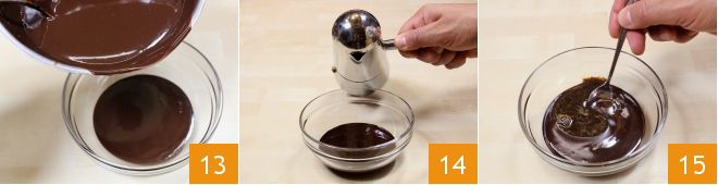 When the coffee is ready, for each cup, pour into a bowl 2.8 oz (80 g) of still-warm chocolate 13 and add 1.8 oz (50 g) of coffee 14, approximately a small cup, and stir to mix the ingredients well 15.