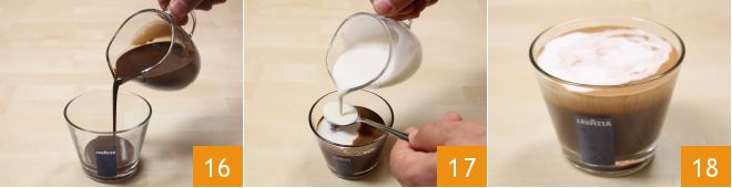 Pour the well-heated mixture into a medium glass 16 and top with the cream topping, which should be very cold, just out of the fridge: pour about 0.68 oz (20 ml) over the chocolate using a spoon so that the topping rests on the coffee, as it should form a layer and not mix with the chocolate 17. Do not stir the bavareisa but drink it as is 18: you'll taste how good it is!