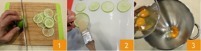 To prepare the coconut and lime Bavarian, you might want to start with the decoration, which takes some time (you could also prepare it the day before): wash and slice the lime into 1/16 inch thick slices 1, then dust them with powdered sugar 2 and dry them in an oven at about 160°F for 6 hours (you could take advantage of the low oven temperature to make meringues to serve with the Bavarian!). Move on to preparing the biscuit: in a stand mixer, start working the eggs 3 with the beaters (you can also use an electric mixer)