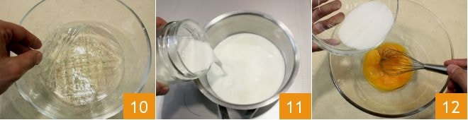 Meanwhile, dedicate yourself to the Bavarian: soak the gelatin in cold water for at least 10 minutes 10. In a saucepan, pour the milk and coconut puree 11 and bring to a boil. Work the egg yolks with the sugar using a whisk 12.