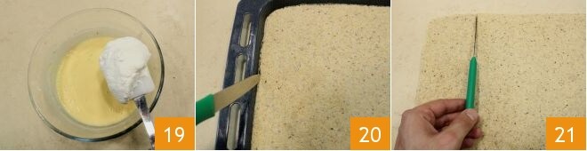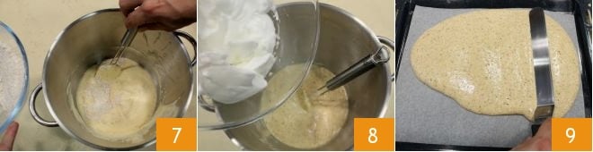 then gradually add the dry ingredients to the eggs 7 and mix with a spatula, also add the whipped egg whites 8, mixing with the spatula from top to bottom to avoid deflating them. Pour the obtained mixture into a baking tray lined with parchment paper of 12x16 inches and spread it with a spatula 9 to get a thickness of 1/5 inch. Bake in a preheated oven at 390°F for about 10 minutes (if using a convection oven, 355°F for 5 minutes): the biscuit should cook without hardening too much.
