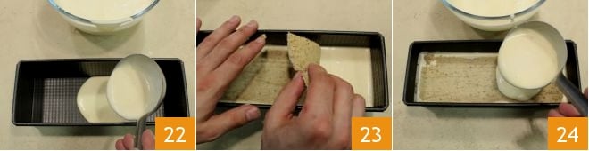 take a loaf pan 8.5x3.5 inches and pour the Bavarian into it using a ladle 22 until just under half of the pan. Gently place a rectangle of biscuit on top of the Bavarian, unrolling it gently 23; finish pouring the Bavarian 24