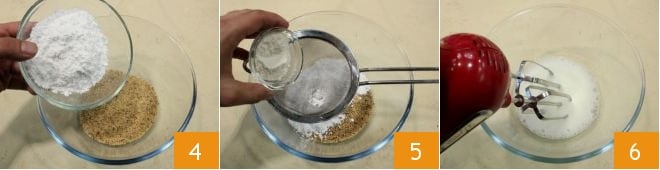 then mix the hazelnut flour, powdered sugar 4, and all-purpose flour 5. Also, whisk the egg whites with a pinch of salt 6