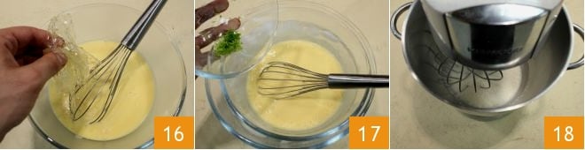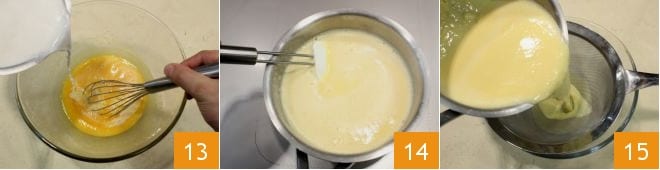 Then pour the hot milk and coconut over the yolks 13, stirring, and transfer the mixture back to the saucepan. Continue cooking over low heat, stirring 14 until the cream coats the spoon. Then strain the cream through a sieve 15