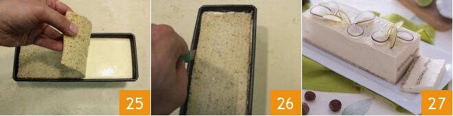 and finish with a rectangle of biscuit 25. Chill in the freezer overnight. Then defrost the Bavarian in the refrigerator for a few hours, then run a small knife along the sides of the pan to unmold the Bavarian more easily 26, turning it over onto a serving plate. You can decorate your coconut and lime Bavarian with the dried lime slices 27.