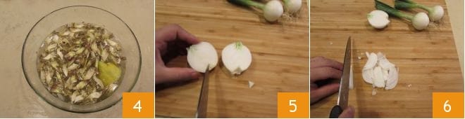 Then transfer them into a bowl with very cold water and lemon 4. Meanwhile, take care of the green onion. Discard the green part and then the base 5 and finally slice thinly 6.