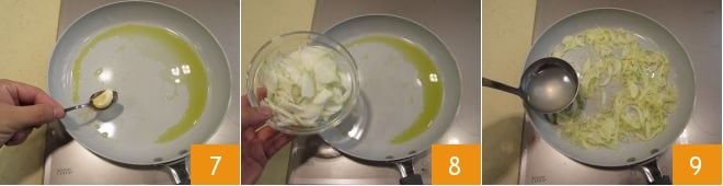 In a pan, pour the oil and heat over medium heat with the garlic for a few moments, then remove it 7. Add the green onion to the base and sauté for a couple of minutes 8. Then pour a ladle of water and let it stew for 10-12 minutes 9.