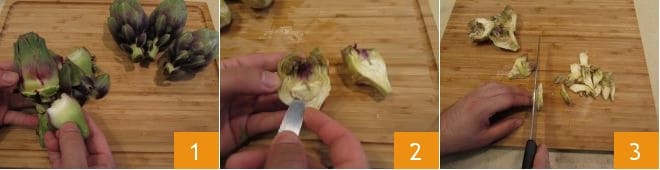 To prepare the bavette with artichokes and sardines, start by cleaning the artichokes. Remove the outer leaves 1, which would be tough when cooked, and cut the artichokes in half. Extract the inner beard 2 and cut the artichokes into not too thin strips 3.
