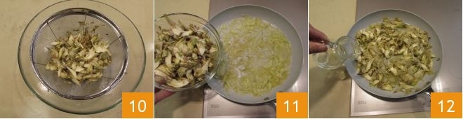 Drain the artichokes from the water 10 and add them to the pan 11. Cook everything for about 10 minutes, deglazing with the white wine halfway through cooking 12.