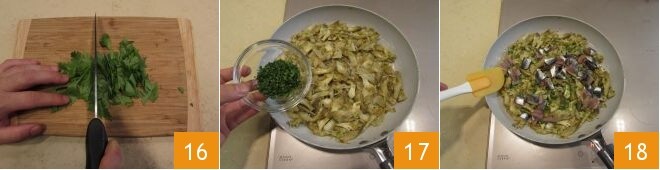 Once your artichokes are cooked, finely chop the parsley 16, add it to the pan 17, and also add the sardines 18, continuing to cook for about 5 minutes.