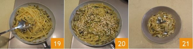 Drain the pasta al dente and add it to the pan 19. Add the pine nuts 20, mix everything, and plate 21. Serve the bavette with artichokes and sardines hot!