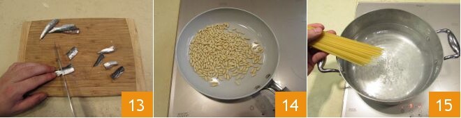 In the meantime, cut the sardine fillets into chunks of about 3/4 inch 13. If you don’t have fillets but whole sardines, you will need to clean them: remove the fresh sardines' heads, apply slight pressure with your fingers to open them like a book and remove the central bone, gently pulling it with your fingers. Also cut the tail with scissors and rinse the obtained fillets well under running water. Once the sardines are cut, place the pine nuts in a pan and toast them for 4-5 minutes 14, stirring them occasionally. At this point, throw the bavette into abundant boiling water, salted to taste 15.