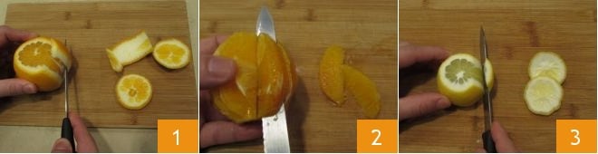 To prepare the bavette with citrus pesto, start by peeling the citrus fruits: with a paring knife, remove the ends of the oranges, down to the flesh; then remove the peel including the white part, following the curve of the segment 1; extract the segments one by one to free them from the skin that covers them 2, proceed the same way with the lemons: remove the ends, then the peel and the white part 3