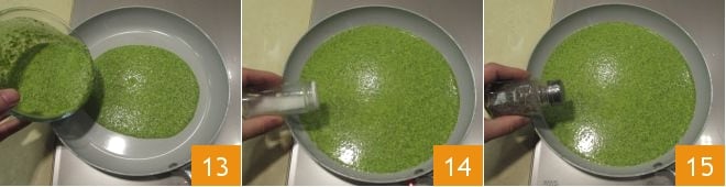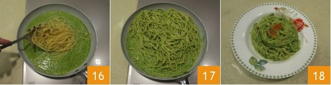Meanwhile, pour the pesto into a large pan 13 or a sauté pan, salt 14 and pepper 15 to taste.