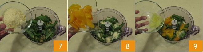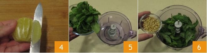 then extract the segments 4 as you did with the oranges. Now take the basil leaves (you can clean them with a dry cloth or wash them in a bowl with cold water, very gently; then dry them always gently with kitchen paper) and place them in a mixer with blades 5, add the pine nuts 6,