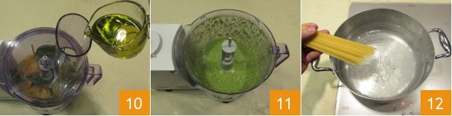 Finally, drizzle in the olive oil 10 and operate the processor to blend the mixture until smooth 11. Meanwhile, in a large pot, bring water to a boil, salt it, and cook the bavette 12; cook them al dente.