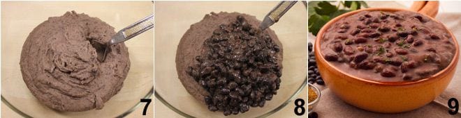 Take 3/4 of the beans, mash them with a fork or blend them 7; then mix the bean puree with the whole ones 8; and place the obtained bean cream in 4 individual bowls that you have kept warm 9.