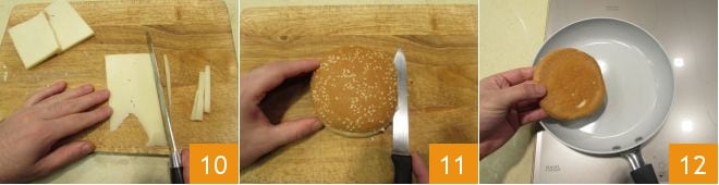 Remove the outer rind from the cheese 10 and cut it into slices the same size as the hamburger buns. At this point, cut the hamburger buns in half 11 and toast them for a few minutes in a large, non-stick pan 12. You should get a light crust on the part you toast in the pan. Set the bread aside.