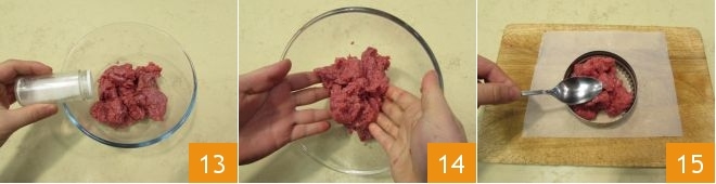 Now proceed to the preparation of the burger: place the ground beef in a bowl, salt 13 and pepper it. Season and massage the meat with your hands 14. Now place a sheet of parchment paper on a cutting board or work surface; use a 4.5-inch diameter pastry ring and place 7 oz of ground beef inside, pressing it with the back of a spoon 15.