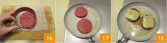 Then remove the pastry ring: you should obtain a compact burger 16 (if you don't have a pastry ring of the indicated size, you can create the burger simply by putting together 7 oz of meat, flattening it, and measuring the diameter with a ruler). Repeat the operation until you have used up the meat. Then cook them in a pan where you have slightly heated the oil: sear the meat for about 4 minutes on one side 17; flip them to the other side and place a slice of fontina on each burger 18 and cook for another 4 minutes: the cheese should melt.