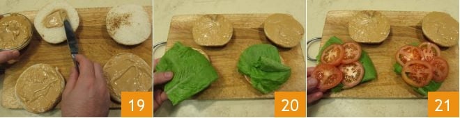 Once the meat is ready, spread the mayonnaise on all the halves of the buns 19, then place a slice of lettuce 20 and the tomato slices 21 on four halves.