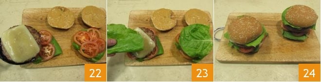 Complete the beef burgers with soy mayonnaise by placing the meat 22 and another lettuce leaf 23. Close the burger with the respective bun halves. Your beef burgers with soy mayonnaise are now ready to be enjoyed 24!