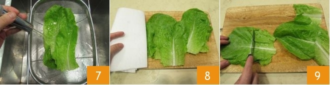 Wash the lettuce as well 7 and dry it thoroughly 8. Then, divide the leaves in half 9 and also set them aside.