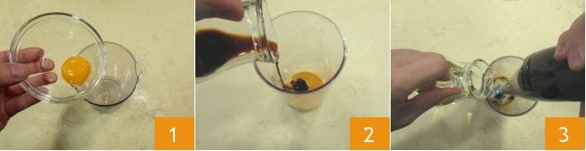 To prepare the beef burger with soy mayonnaise, start with the preparation of the latter: in a narrow and tall container, pour the egg yolk 1 and add the soy sauce 2 (we used low-sodium soy sauce). At this point, immerse the blender and turn it on, pouring the vegetable oil in a thin stream while the blender is working 3.