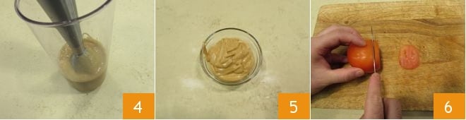 Blend the ingredients well until you get a homogeneous sauce 4. At this point, the soy mayonnaise will be ready: transfer it to a small bowl 5 and place it in the refrigerator while you dedicate yourself to the rest of the preparation. Take the tomatoes, rinse and dry them, then slice them 6 and set the slices aside.