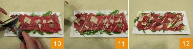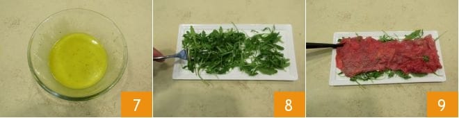 Once ready 7, put the sauce in a dispenser. Arrange the arugula on a serving plate, distributing it evenly 8, cut the meat into very thin slices with the help of a slicer, and distribute it over the arugula 9.