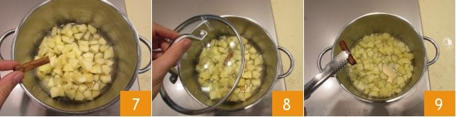 Pour the water into a pan, add the lemon juice 4, the sugar 5, and the apple cubes 6.