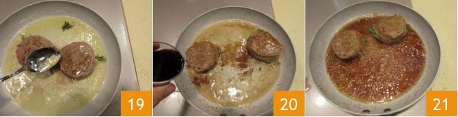 Continue cooking for another 4-5 minutes, basting the fillets often with the cooking juices 19. At this point, deglaze with the red wine 20 and wait a couple of minutes until the alcohol has completely evaporated 21.