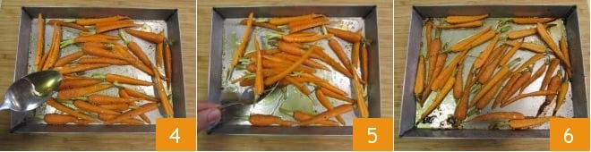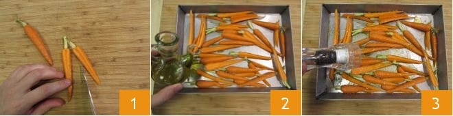 To prepare the beef steak with two curries, start with the accompanying carrots. Wash them and cut them in half lengthwise 1. Then arrange them on a baking sheet and season with salt, oil 2, black pepper 3.