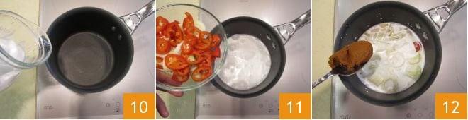 In a saucepan, pour the coconut milk 10, add chili, lemongrass, and leek 11. Turn on the heat, add the yellow curry paste 12, mix everything