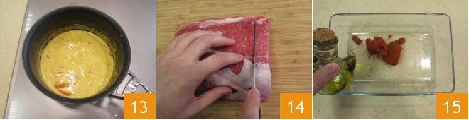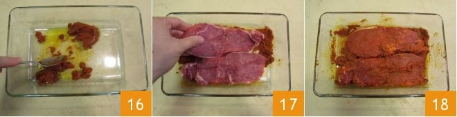 Mix with a spoon 16 until the paste dissolves. Then place the slices of meat inside 17 and turn them over to season both sides 18.