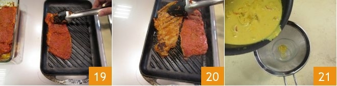 Heat a grill well, and as soon as it's hot, lay the slices of meat on top 19. Wait a couple of minutes and turn them 20. Cook them for another couple of minutes and in the meantime, heat and strain the coconut milk sauce 21.