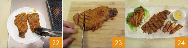 As soon as the meat is grilled on the other side 22, transfer it to a cutting board and cut it into strips 23. Arrange the carrots on a lettuce leaf, sprinkle the meat with chopped parsley, and serve with the coconut milk sauce 24.