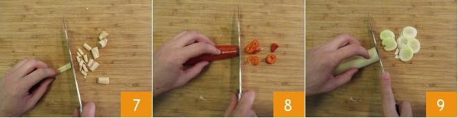 Move on to the sauce. Clean and cut the lemongrass 7, chili 8, and leek 9 into pieces.