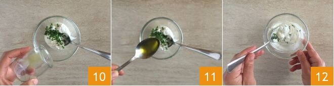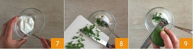 Set the calamari aside and prepare the accompanying sauce. Pour the Greek yogurt into a bowl 7, add the chopped chives 8, the lime zest 9