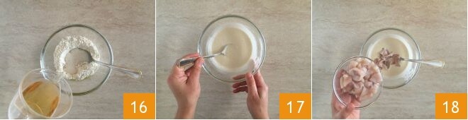 Add the beer 16 and stir until you get a smooth batter 17. Then pour the well-drained calamari inside 18 and mix everything to ensure the batter adheres perfectly.