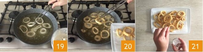 When the oil is hot, fry the calamari. You can use tongs to transfer them to the pan 19 to remove excess batter. Cook for 2-3 minutes until the batter is golden. Then drain them and transfer them to a tray lined with kitchen paper 20. Salt 21 and serve your beer-battered fried calamari with the Greek yogurt sauce.