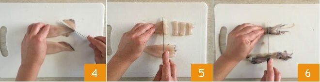 Then also remove the fins 4 and cut the calamari into rings 5. Take the tentacles, remove the eye area 6 and the central beak by pushing it out.